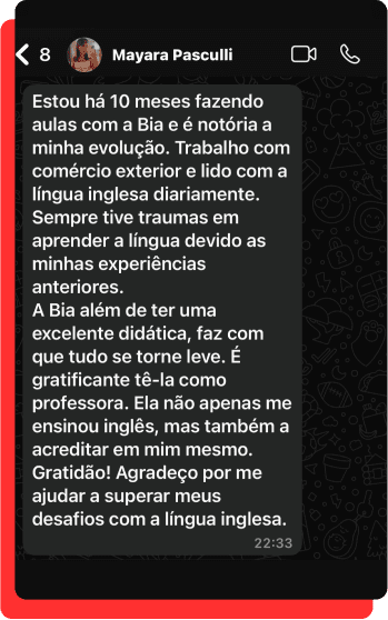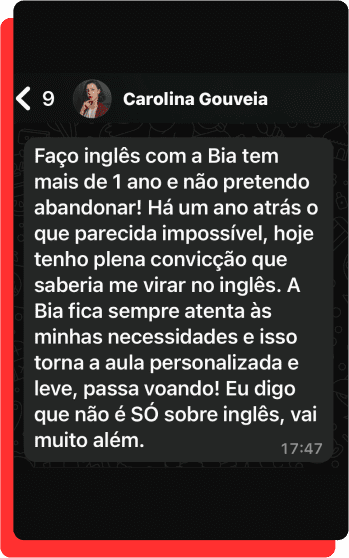 Muito prazer! Sou Bia Tomba, professora de inglês há 6 anos e estudo o idioma há mais de 18.