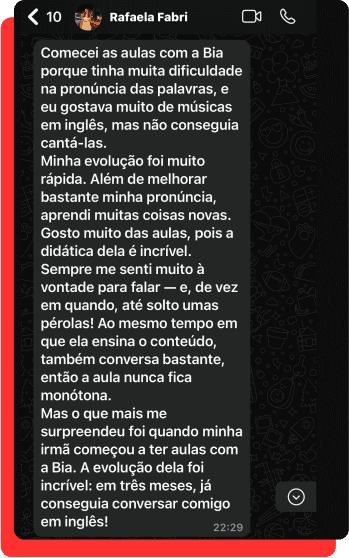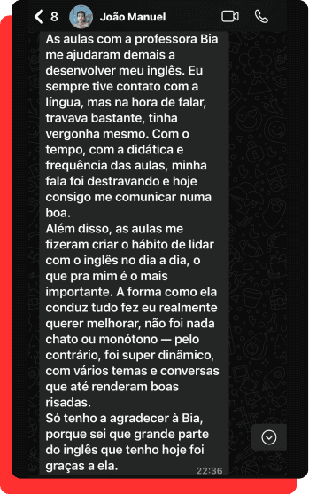 Ao longo da minha trajetória, ajudei inúmeros alunos a destravar a fala em inglês, e foi justamente essa experiência que me levou a desenvolver minha própria metodologia, com foco total na conversação.